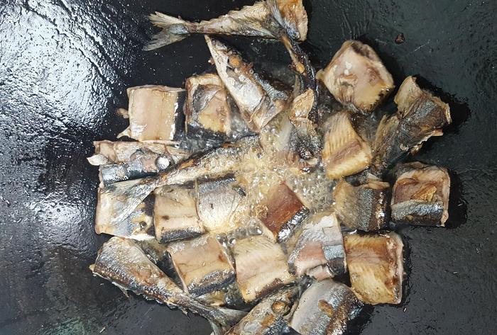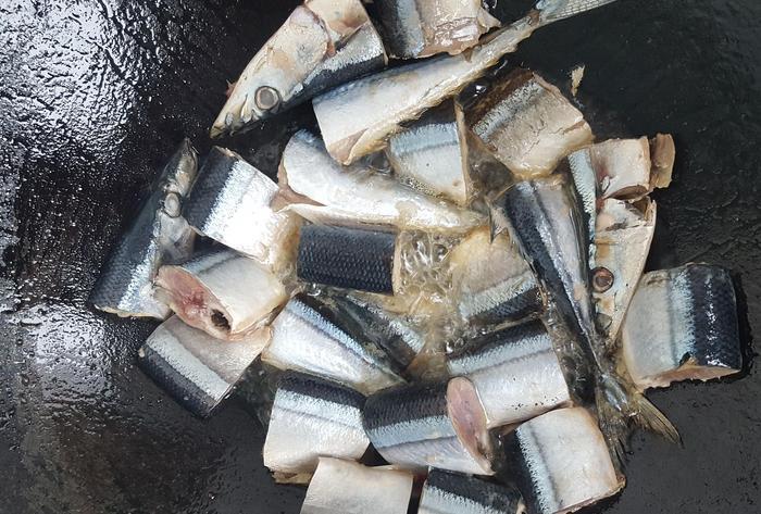 3.锅里倒油,加入一匙盐在锅底,秋刀鱼切段下锅煎