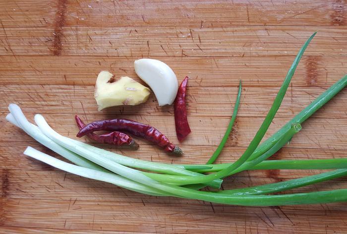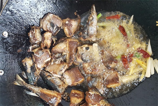 5.鱼用锅铲挪向一边,切好的姜蒜、辣椒、葱白放进去爆香,翻炒均匀