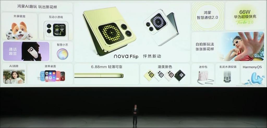 华为 nova Flip 主打轻薄设计,素皮版展开厚度为 6.88mm,玻璃版展开厚度为 6.9mm,耐久性方面获得了瑞士 SGS 120 万次弯折耐久认证。产品首发通话趣显 Call-emoji、外屏游戏、萌宠主题等功能,最新的 HarmonyOS 4.2 系统支持外屏实况窗口显示。