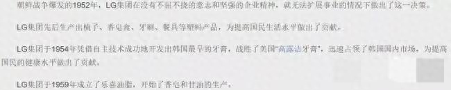 如果查询三星和LG的发展历史,可以发现70年代之前卖糖和毛织品的三星和卖牙膏、肥皂、甘油的LG是没有业务冲突的,没有利益冲突自然也就没有横眉对白眼的扯头花。