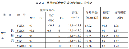 硬质合金刀具是将一些难熔的、高硬度的合金碳化物微米数量级粉末与金属黏结剂按粉末冶金工艺制成的刀具材料。常用的合金碳化物有 WC、TiC、TaC、NbC 等等,常用的粘合剂有 Co 以及 Mo、Ni 等。 合金碳化物是硬质合金的主要成分,具有硬度高、熔点高、化学稳定性好等特点。因此,硬质合金的硬度、耐磨性和耐热性均超过高速钢,切削温度达到 800℃~1000℃时仍能 切削速度可以提高 4~10 倍。其缺点是抗弯强度低 W18Cr4V 的 1/4~1/2; 冲击韧性差,为 W18Cr4V 的 1/4~1/3;由于硬质合金常温硬度高,除磨削外,很难采用切削法制造复杂的形状结构,因此可加工性差。 硬质合金的性能取决于化学成分、碳化物粉末的厚度及其烧结工艺。当碳化物含量增加时, 硬度增加,抗弯强度降低,适合粗加工;当粘合剂含量增加时,抗弯强度增加,硬度降低,适合精加工。