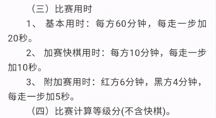 如果战成平手怎么办呢?规程未明确,但“比赛用时”里有“加赛快棋用时”、“附加赛用时”。因此,如果打平不分胜负,很可能是加赛快棋,如果快棋还是打平,则进行附加赛(和棋黑胜)。
