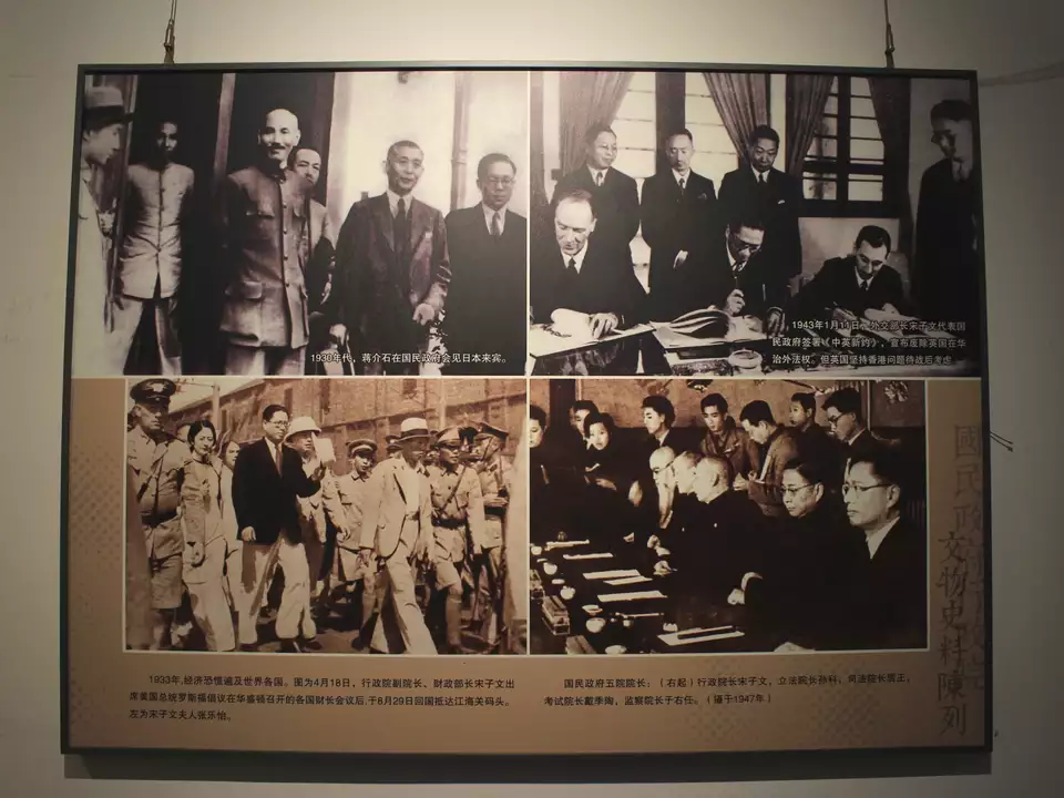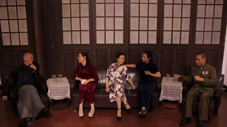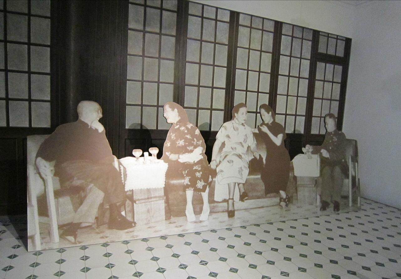 蜡像范本照片摄于1948年5月20日。蒋介石、李宗仁被选为正副总统,蒋介石夫妇及李宗仁夫妇于就职典礼后在总统府休息室小憩。 整组蜡像自左至右依次为蒋介石、孙科夫人陈淑英、宋美龄、郭德洁和李宗仁,通过艺术手法真实再现了珍贵的历史瞬间,有着很强的观赏性和仿真感染力。作为“总统府文物史料陈列”的有机组成部分,该组蜡像使得原有的民国文物史料展更具生动性,吸引了众多游客