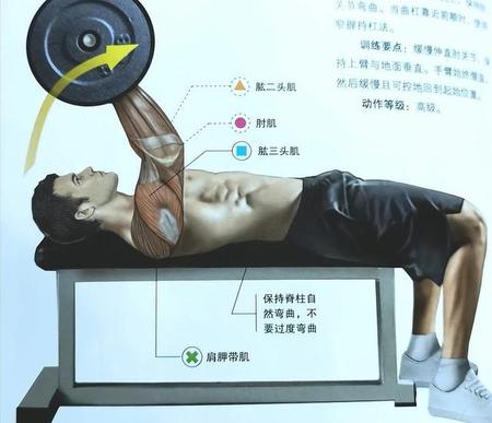 杠铃仰卧屈臂伸肌肉图解: