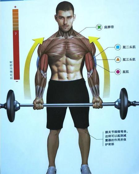 吸气,并屈肘,举起杠铃时,同时臀部,腹部,以及背部肌肉紧张收缩。,同时保持躯干与脊柱稳定。