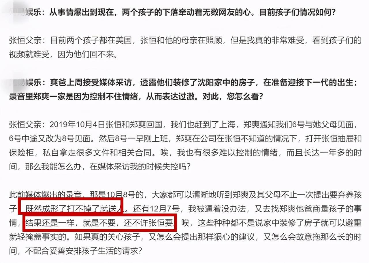 郑爽父亲曾出面道歉,表示郑爽代孕是因为身体原因,至于郑爽是否出轨没有回应。郑爽父亲也否认了弃养,表示孩子出生之后,他们就发了律师信要求争夺孩子的抚养权。很快张恒父亲就出面回应,表示郑爽和她的家人一直都打算弃养,而且还不要张恒要孩子。郑爽的打算是,拿到抚养权之后,就交给福利院收养,她们已经联系好了福利机构。郑爽还向张恒提供了手写合同,要求张恒赔偿3600万元,才答应张恒和解的要求。对于郑爽提出无法联系张恒说法,张恒父亲出面回应,其实是郑爽拉黑了张恒。