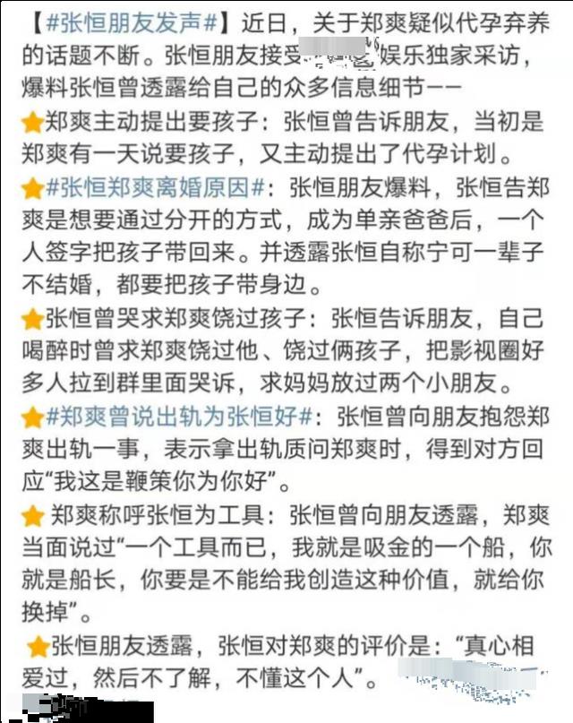 郑爽此前风波理直气壮地回应,还激怒了张恒朋友,好几个张恒朋友都出面锤郑爽。甚至爆料郑爽出轨,还说是为了鞭策张恒,郑爽完全把郑爽当成是工具人一样。据悉张恒曾主动求饶,希望郑爽放过两个孩子,但郑爽拒绝了他。