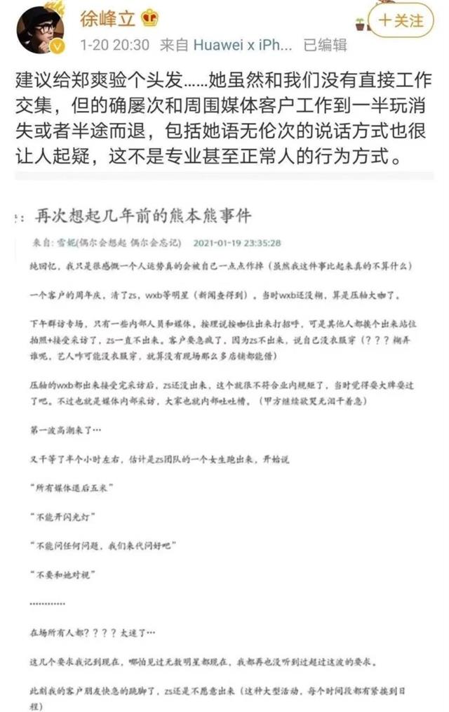 有时尚博主就发声质疑郑爽,要求她去验头发,证明自己的清白,表示郑爽当时的状态语无伦次,完全不是正常人的行为方式。