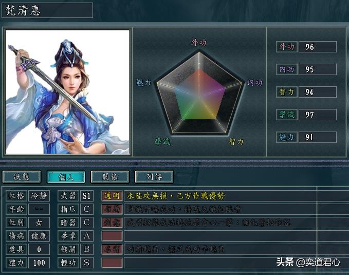 梵清惠(外功96、内功95、智力94、学识97、魅力91)