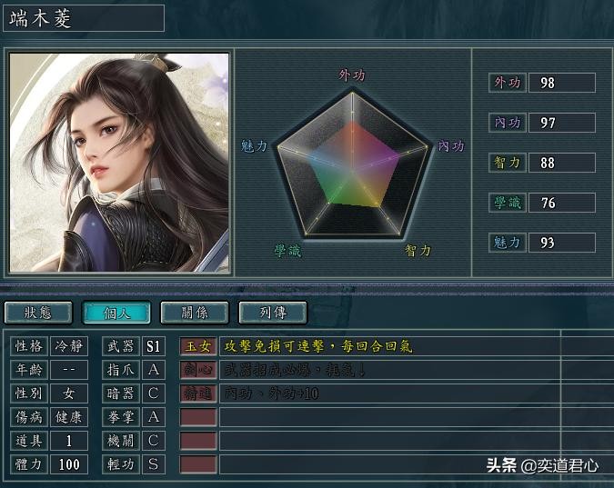 端木菱(外功98、内功97、智力88、学识76、魅力93)