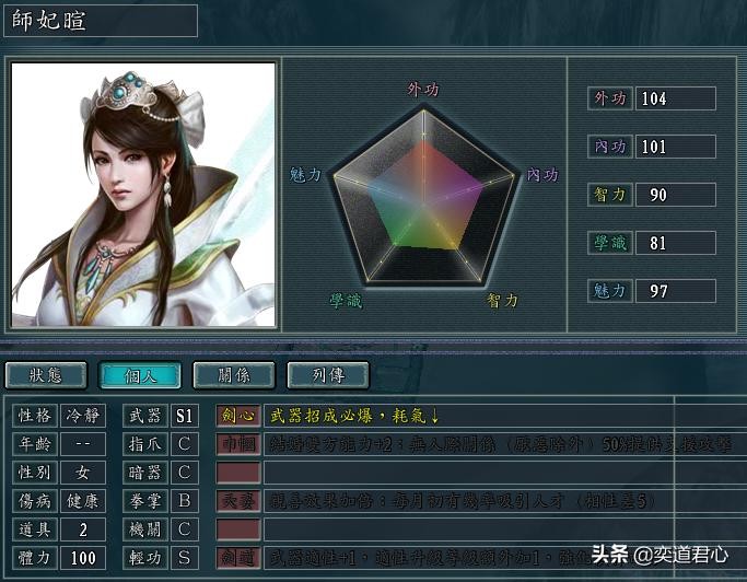 师妃暄(外功104、内功101、智力90、学识81、魅力97)