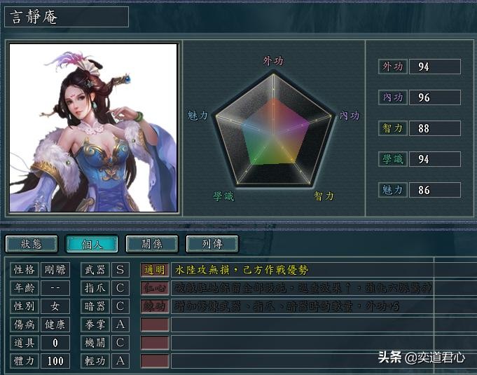因为在默认登场人物中的辈分最高,斋主梵清惠成为了该势力的主公,她的这一套五项基础能力拿到三国志11的原版游戏里连曹老板都能轻松碾压过去。只可惜侠骨留香MOD的数据上限在120以上,她跟同世界的侠客们比起来就没有那么鹤立鸡群了。她的首技能通明令其在陆地和水面上的攻击都不会损伤,效果集合了原版的突袭和强袭,加上武器和轻功两个S级评定,算得上水陆两栖的作战专家。布局的效果和连环差不多,剑意约等于枪将,名宿将伴随功绩的成长而提高战法成功率。