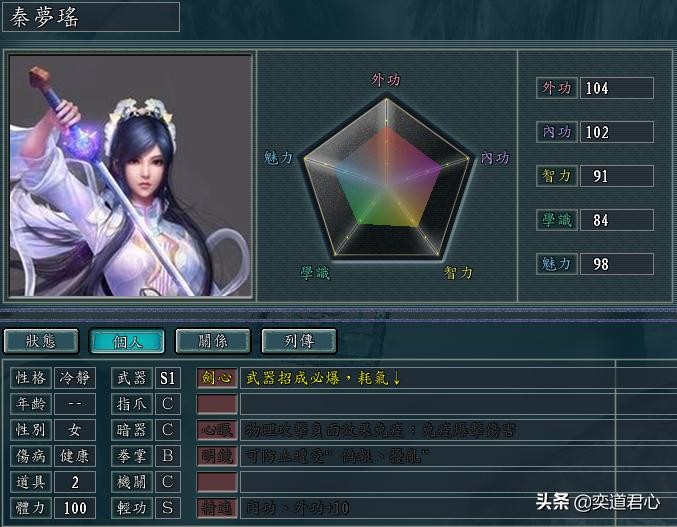 秦梦瑶(外功104、内功102、智力91、学识84、魅力98)