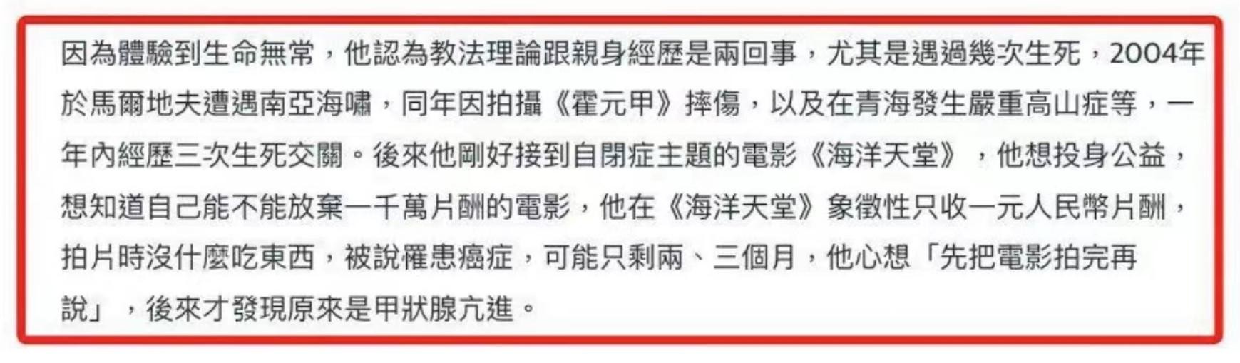 除了拍打戏留下的伤,李连杰在拍《海洋天堂》时,没吃什么东西,以为患上癌症,后来拍完片仔细检查后发现是患上了甲亢。