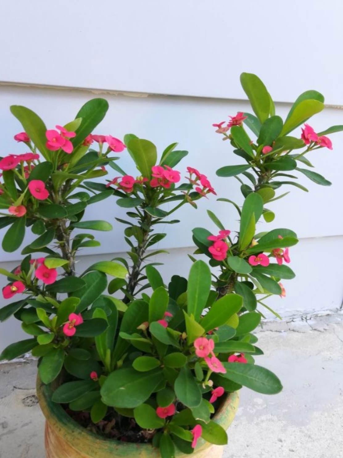 虎刺梅这种小花,开花虽然小小的,但是有红色有粉色,小小的精致鲜艳很耐看,它还特别皮实,开花时间长,至少可以一年开三个季节的花儿,花很多,株型不大,但是美观耐看,养在阳台上,就算不用遮阴也没有关系,会长得很好。