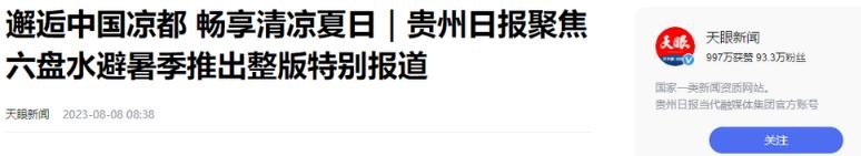 2、原文刊登于天眼新闻2023年8月8日发布的关于《邂逅中国凉都 畅享清凉夏日|贵州日报聚焦六盘水避暑季推出整版特别报道》的报道;