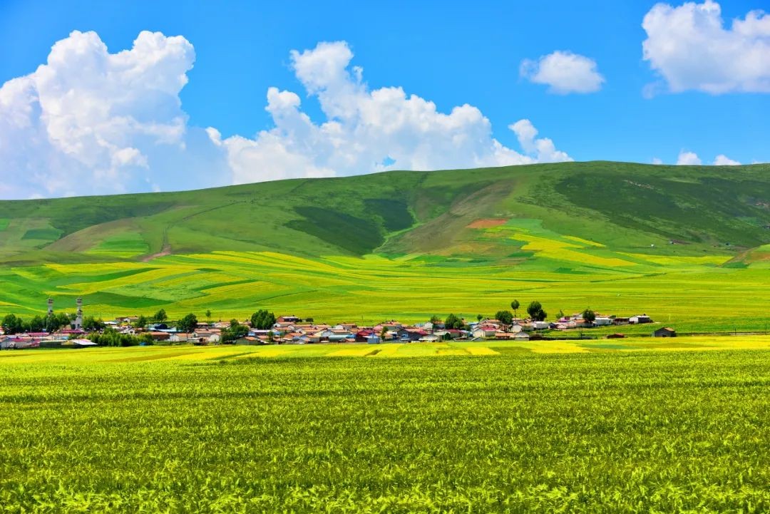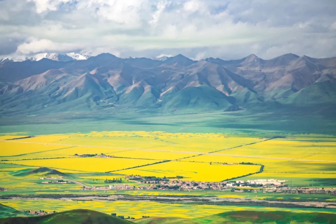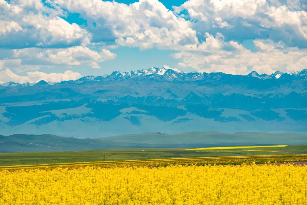 祁连山下,金黄的油菜花像是一张巨大的地毯,惹得摄影师眼花缭乱,生怕镜头捕捉不到它的美。