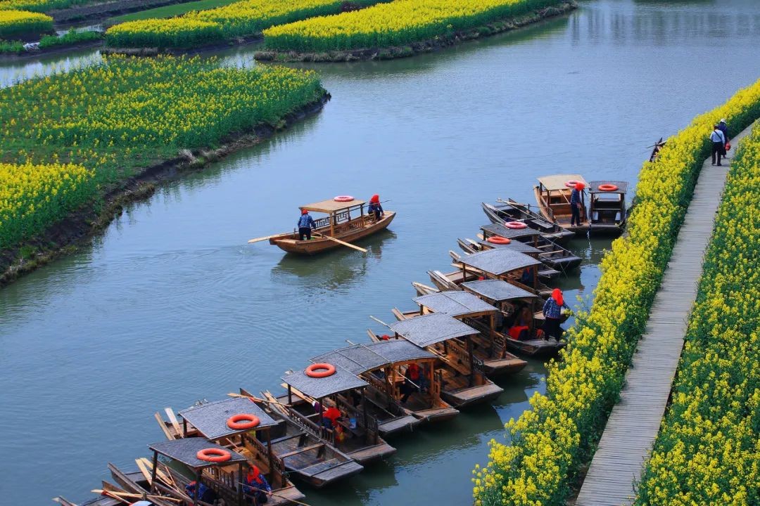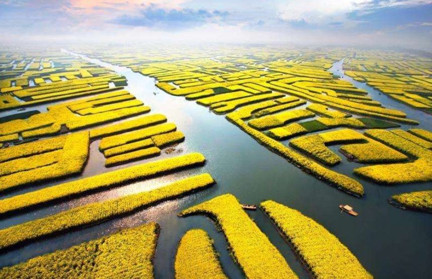 每当清明节前后,油菜花争相盛开,如果你去那里赏花,可以架一只小船,漂浮在水面上,感受由油菜花所带来的美感。