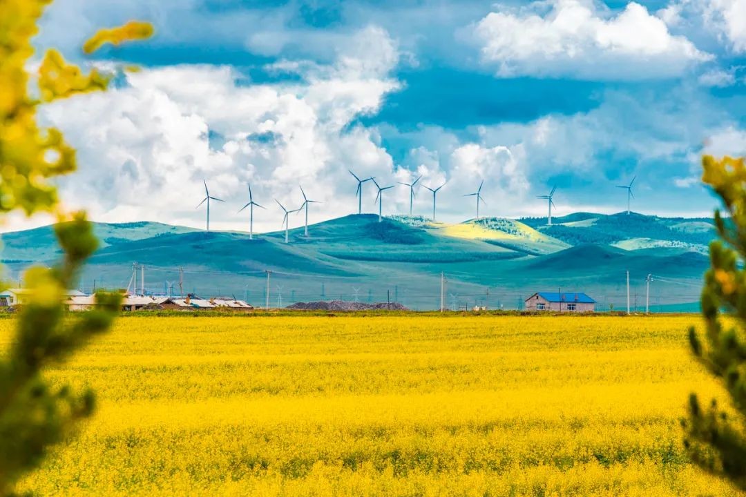 一望无际的油菜花海又惊艳了整个夏季,远处的风车随风转着,天空变得很低很低,伸手都能摸到。
